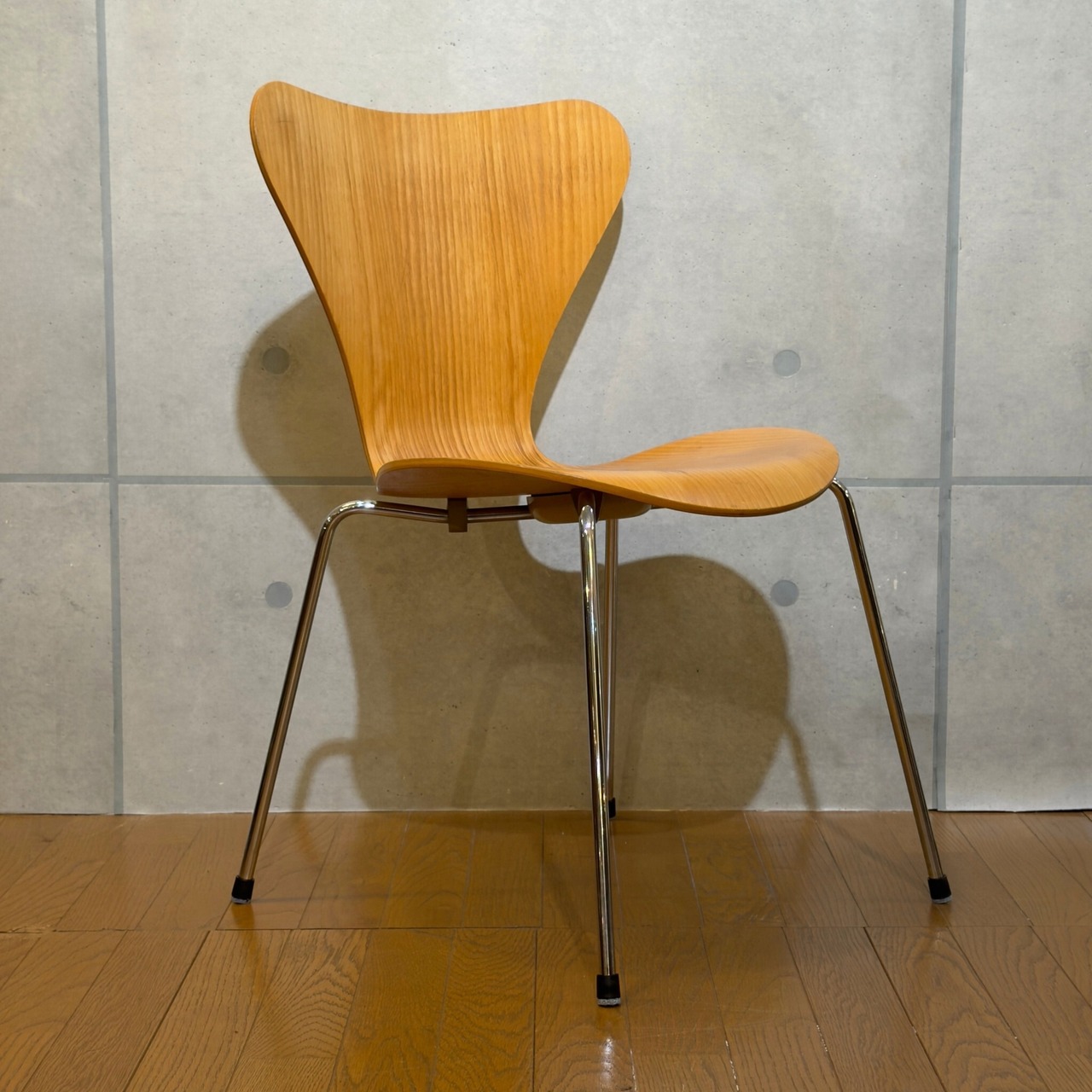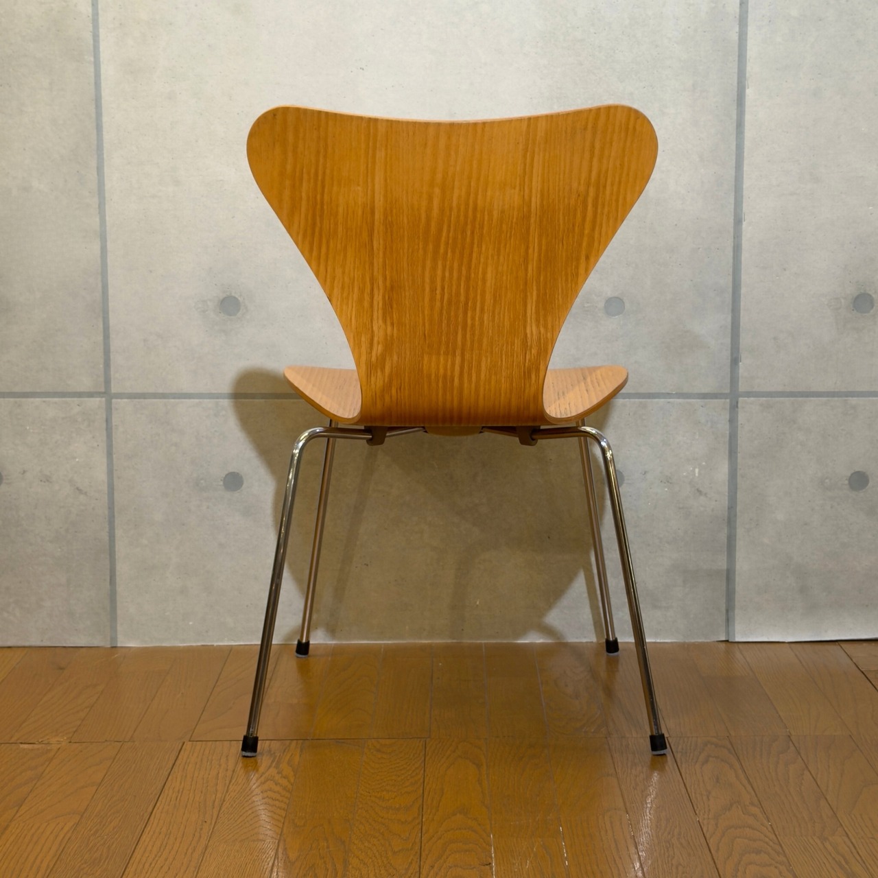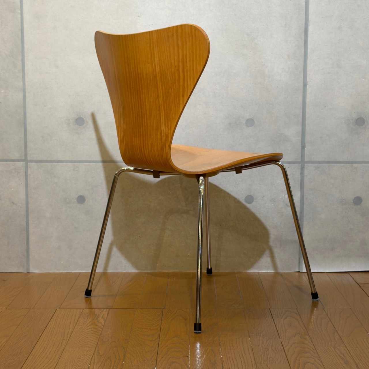 木目を塗りつぶす仕上げではなくオーク突板の表情が見える仕様(クリアラッカー仕上げと思われます)で、クローム脚との組み合わせも軽やかです。背から座まで一枚でつながるラインの美しさはもちろんですが木目の流れが素直に見えて、少し飴色に寄ったトーンが美しいです。明るい木の椅子でありながら軽すぎず、空間の中で浮きにくい印象があります。