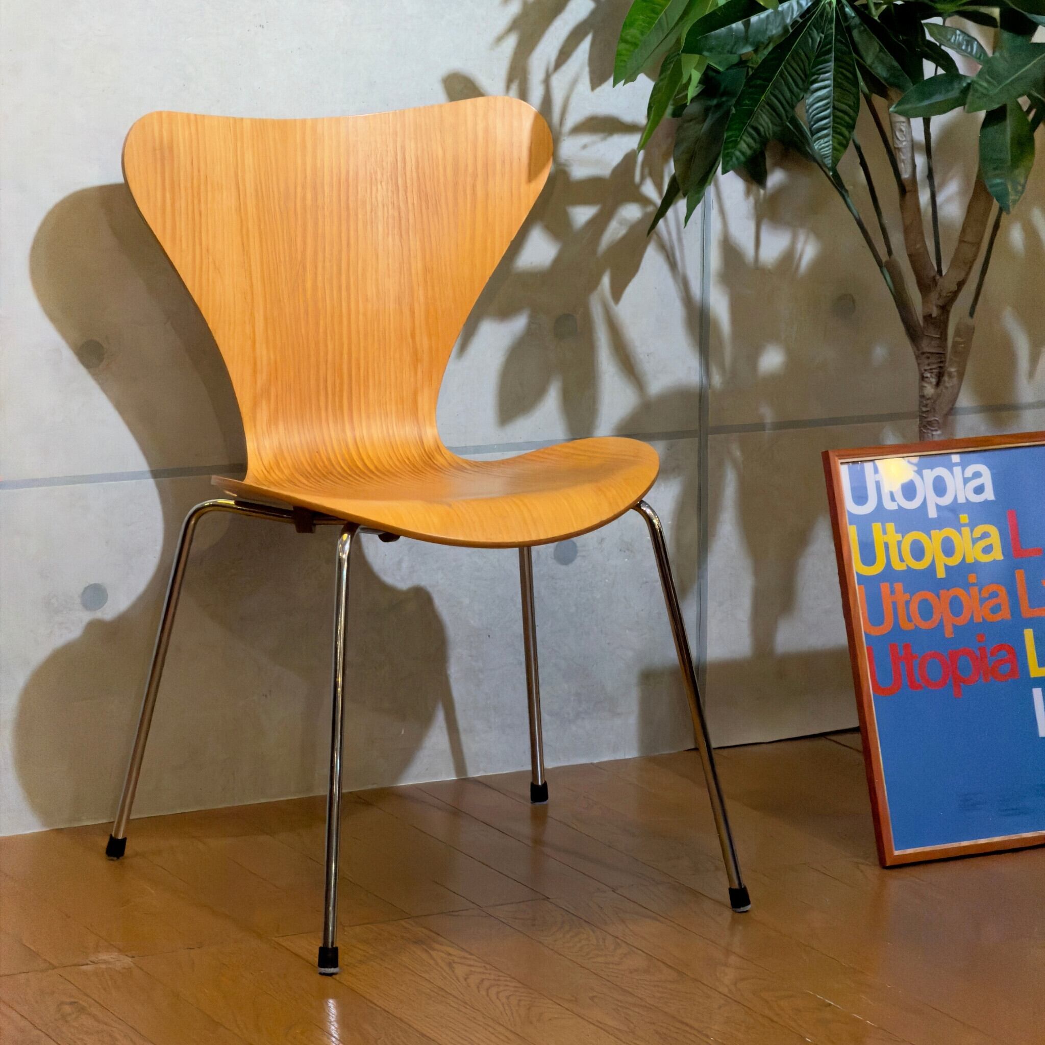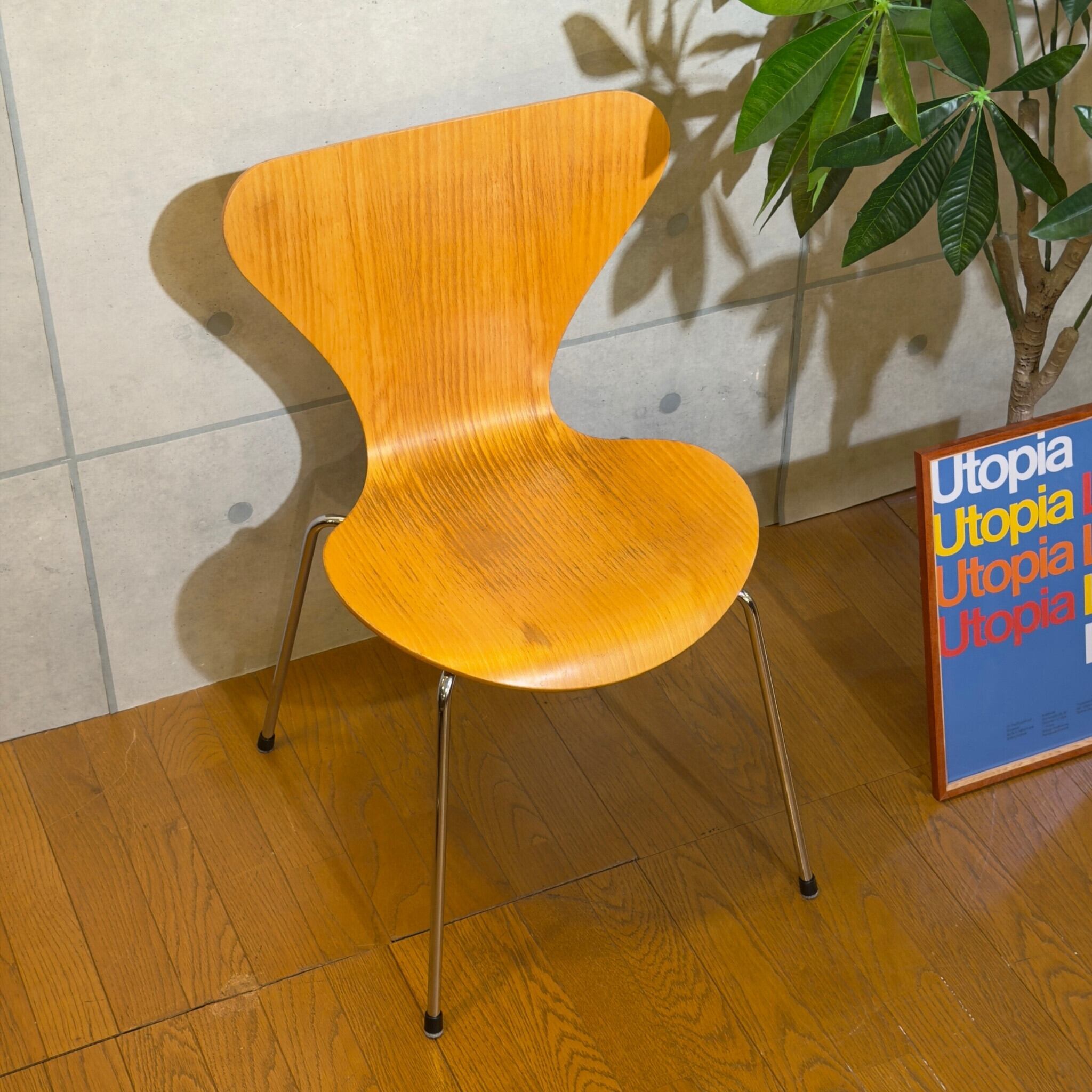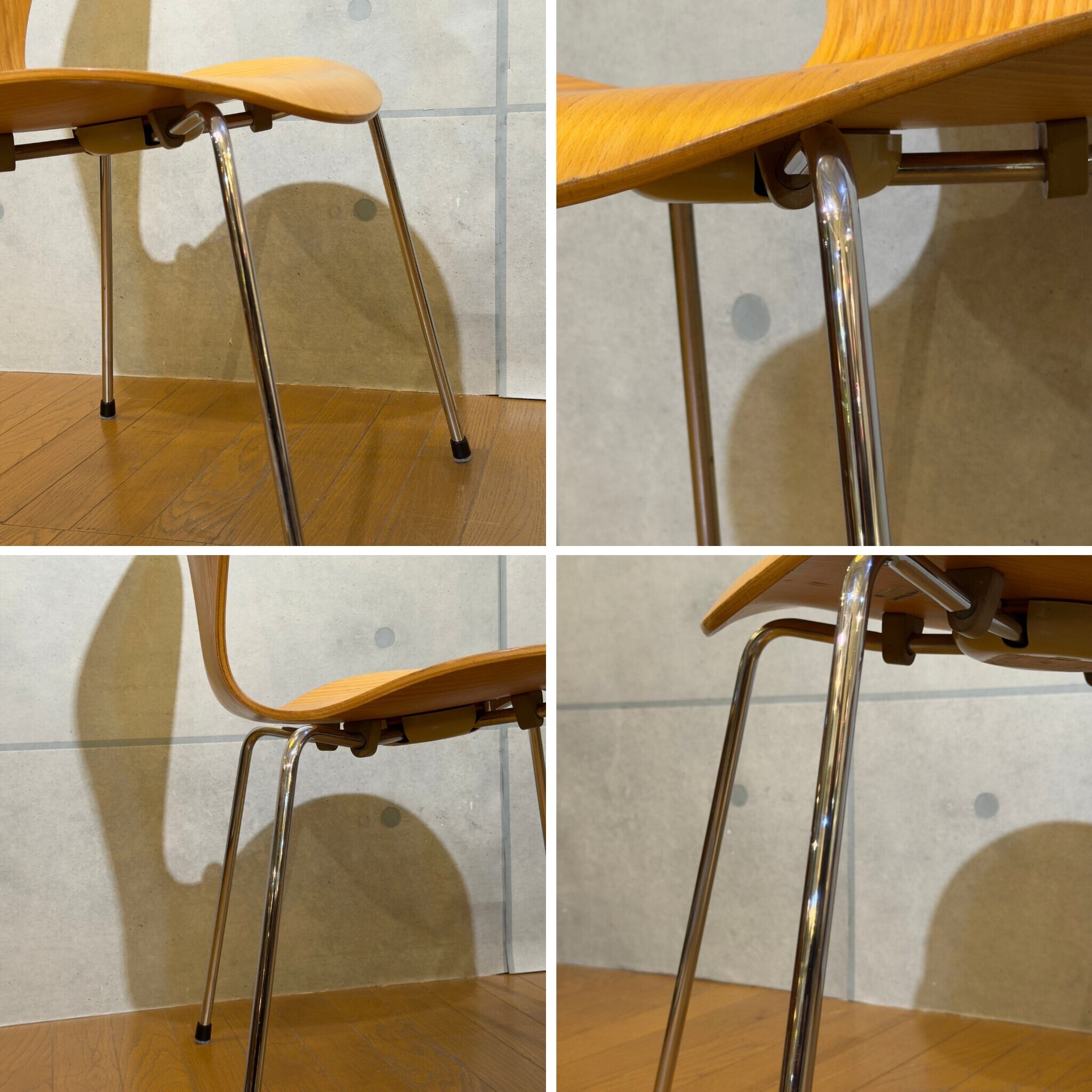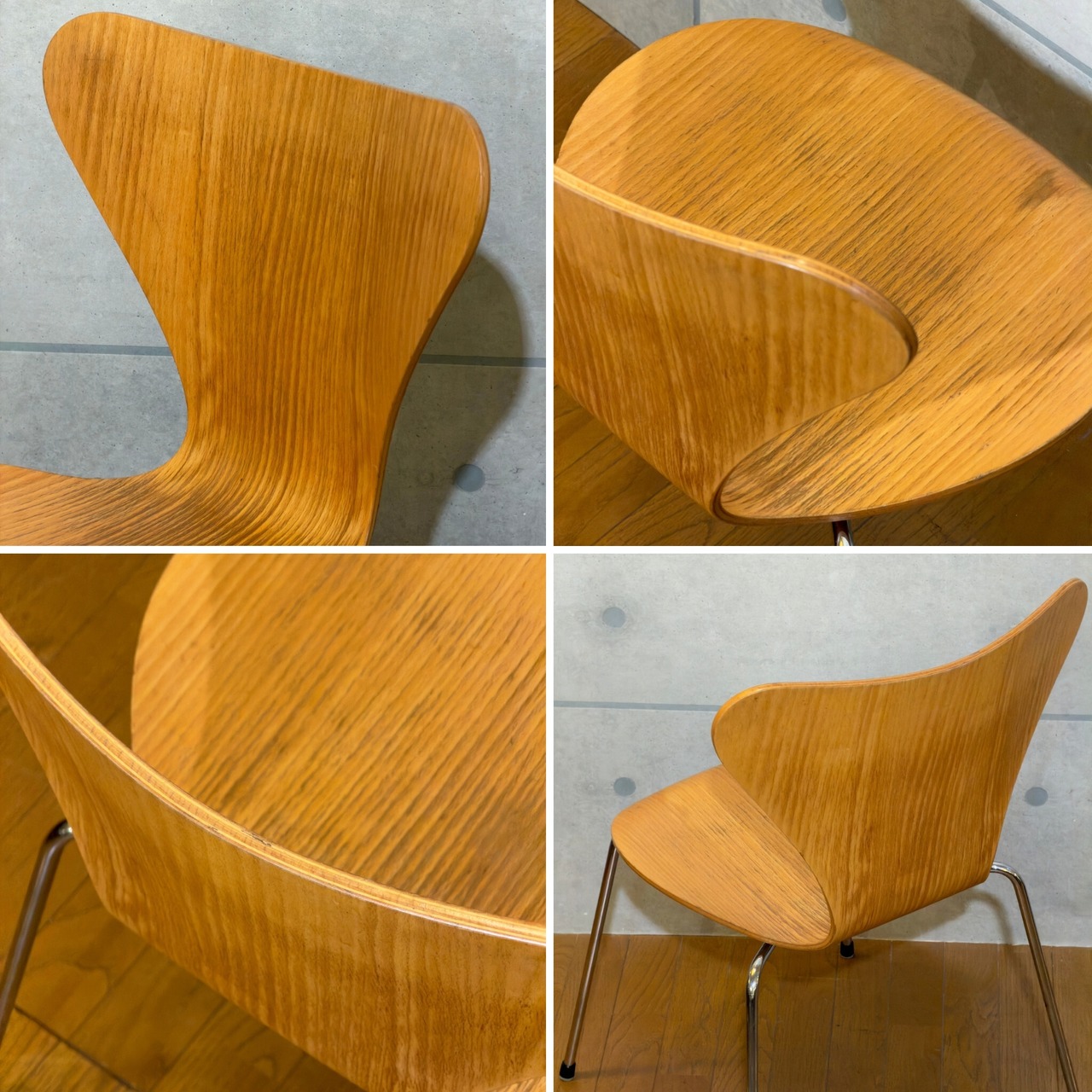 木目を塗りつぶす仕上げではなくオーク突板の表情が見える仕様(クリアラッカー仕上げと思われます)で、クローム脚との組み合わせも軽やかです。背から座まで一枚でつながるラインの美しさはもちろんですが木目の流れが素直に見えて、少し飴色に寄ったトーンが美しいです。明るい木の椅子でありながら軽すぎず、空間の中で浮きにくい印象があります。