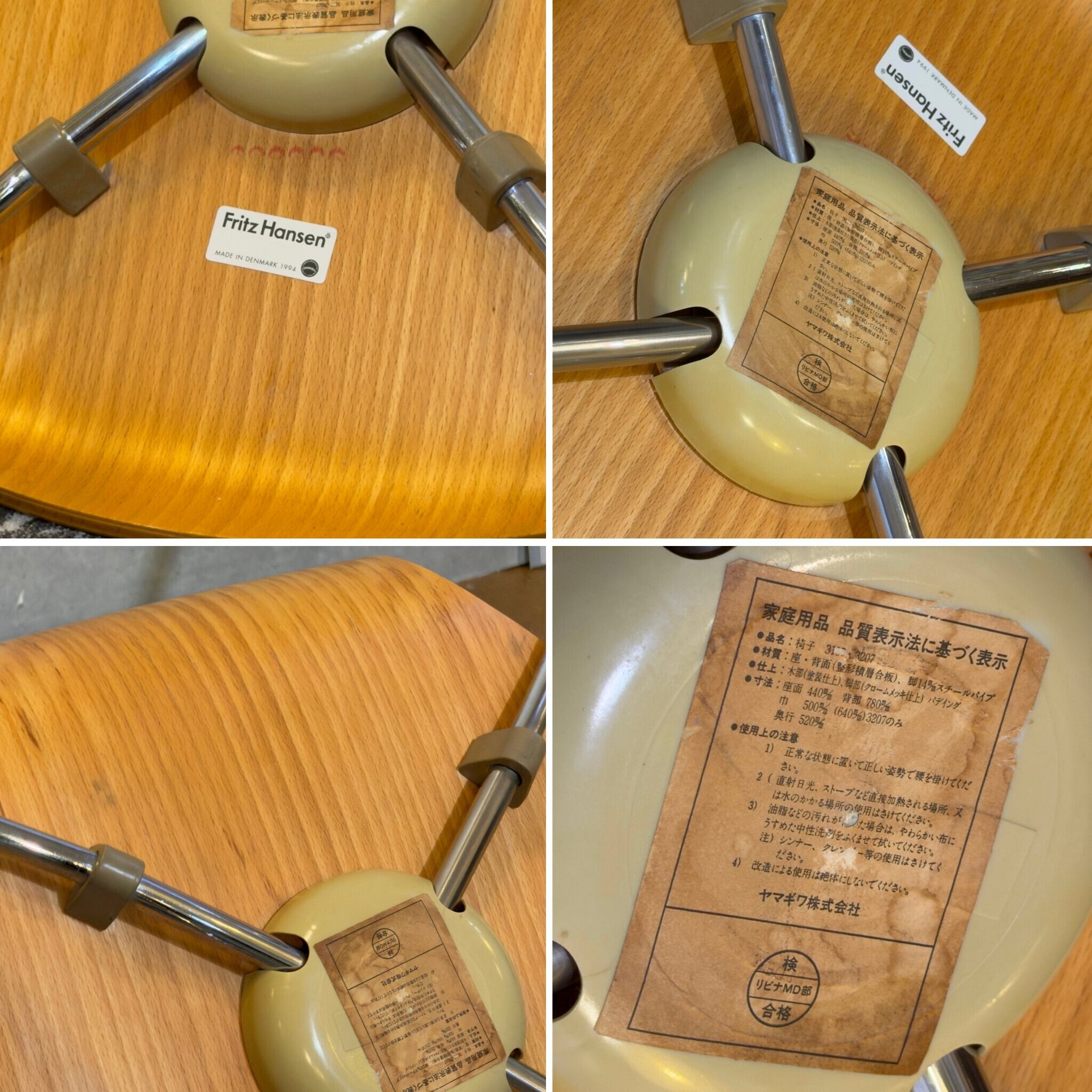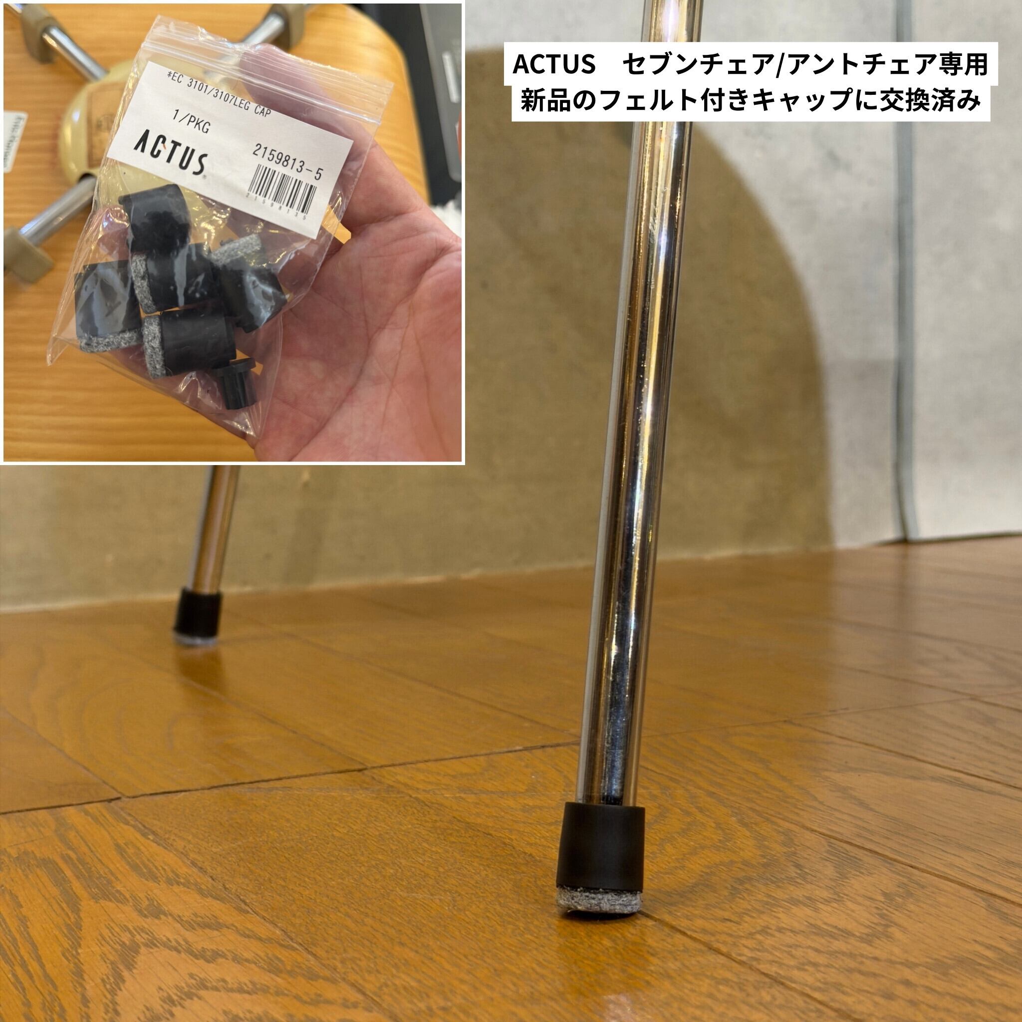 木部はクリーナーで汚れを落としワックスで整えてあります。傷埋めや再塗装は行っていません。クロームメッキの脚部はくすみや白錆をできる限り落とし輝きを取り戻しました。グライズ(脚先キャップ)は ACTUSで公式に販売されているフェルト付きの新品パーツに交換済みです。