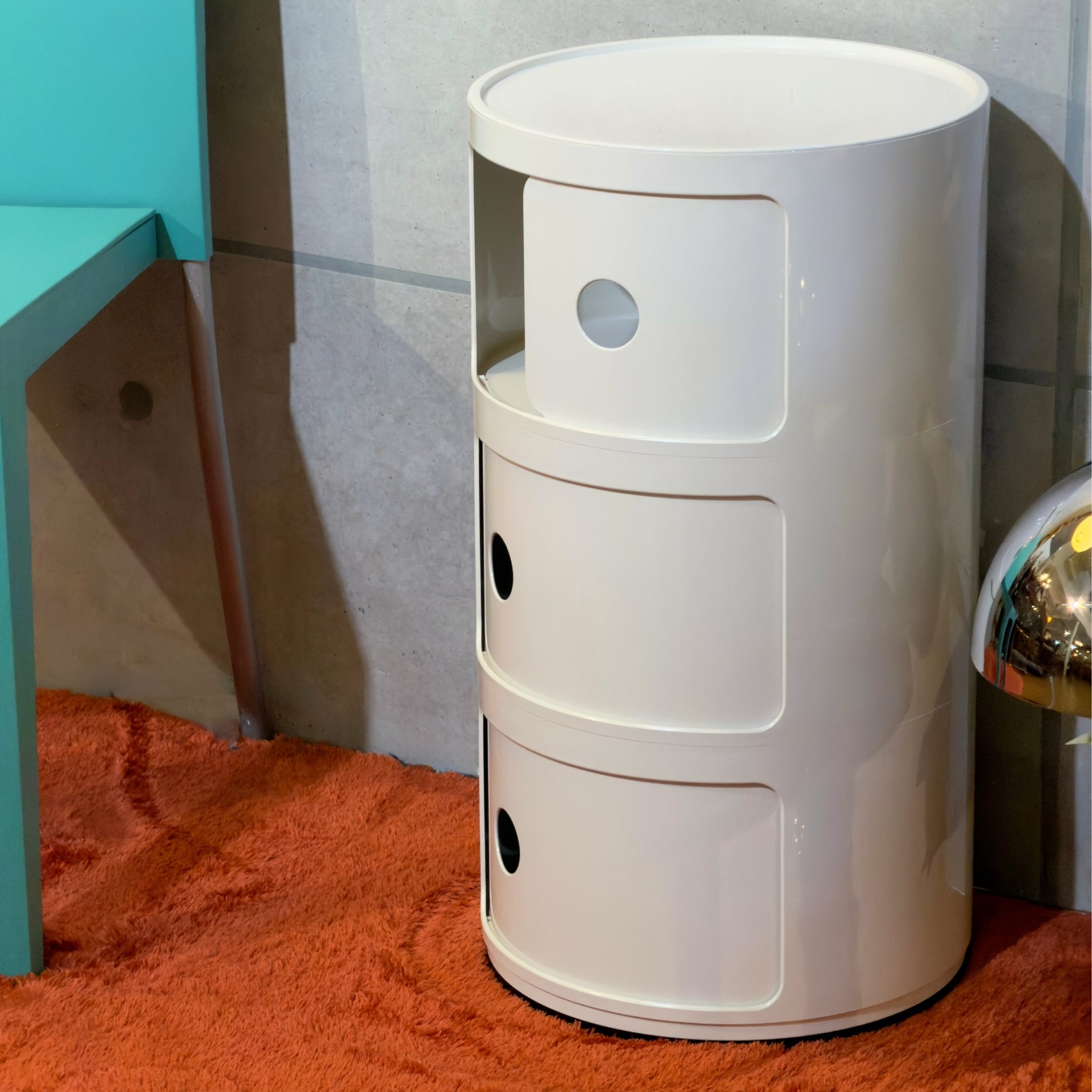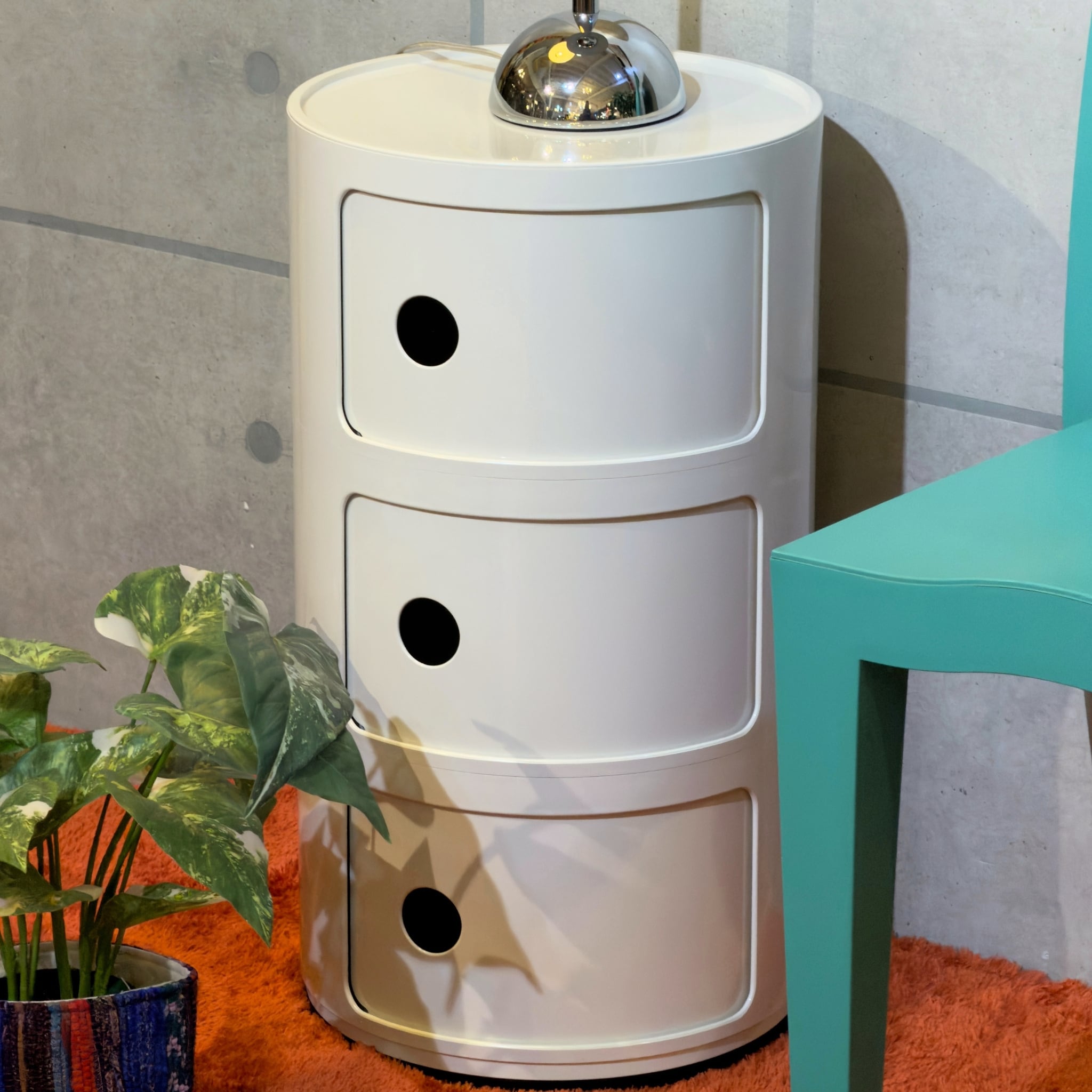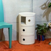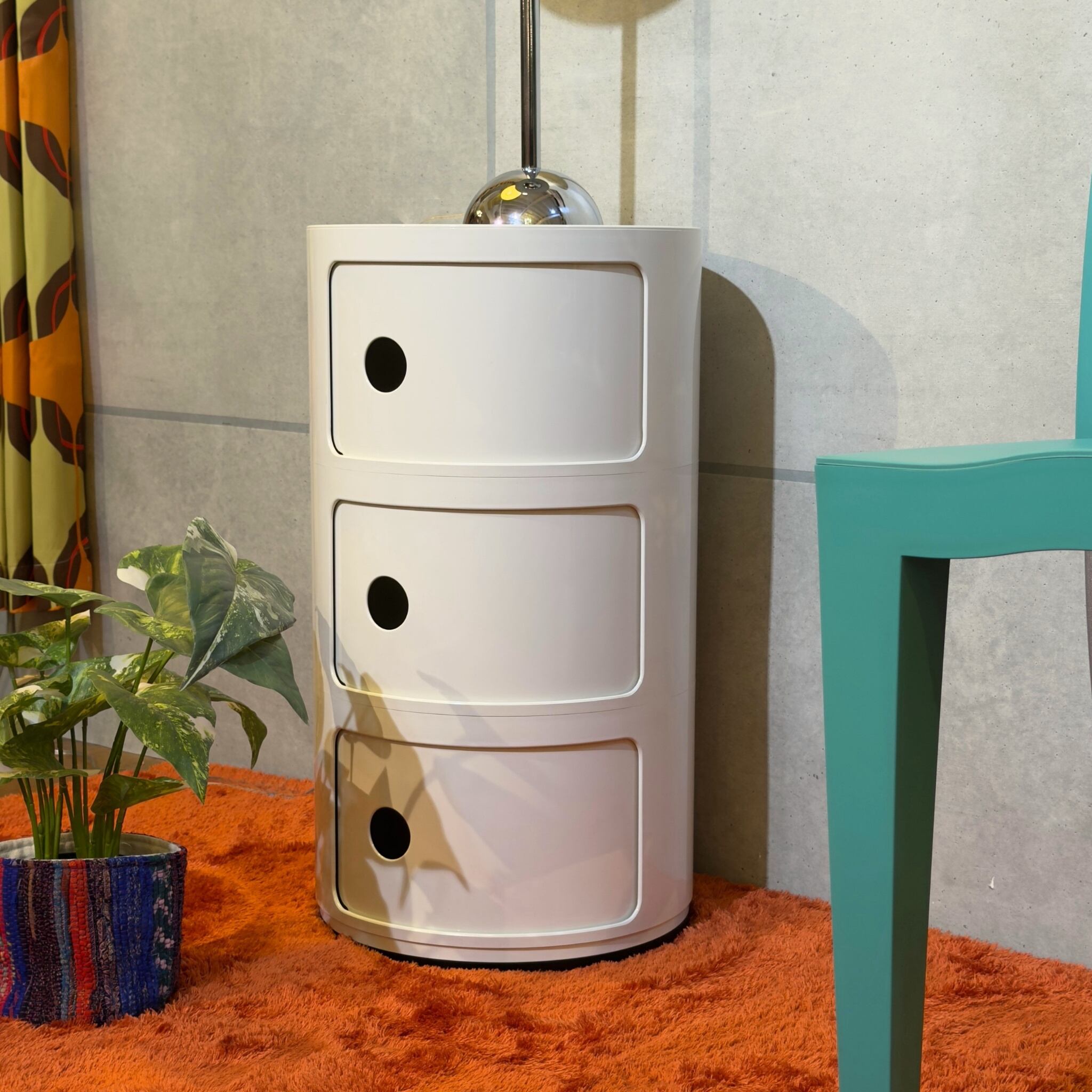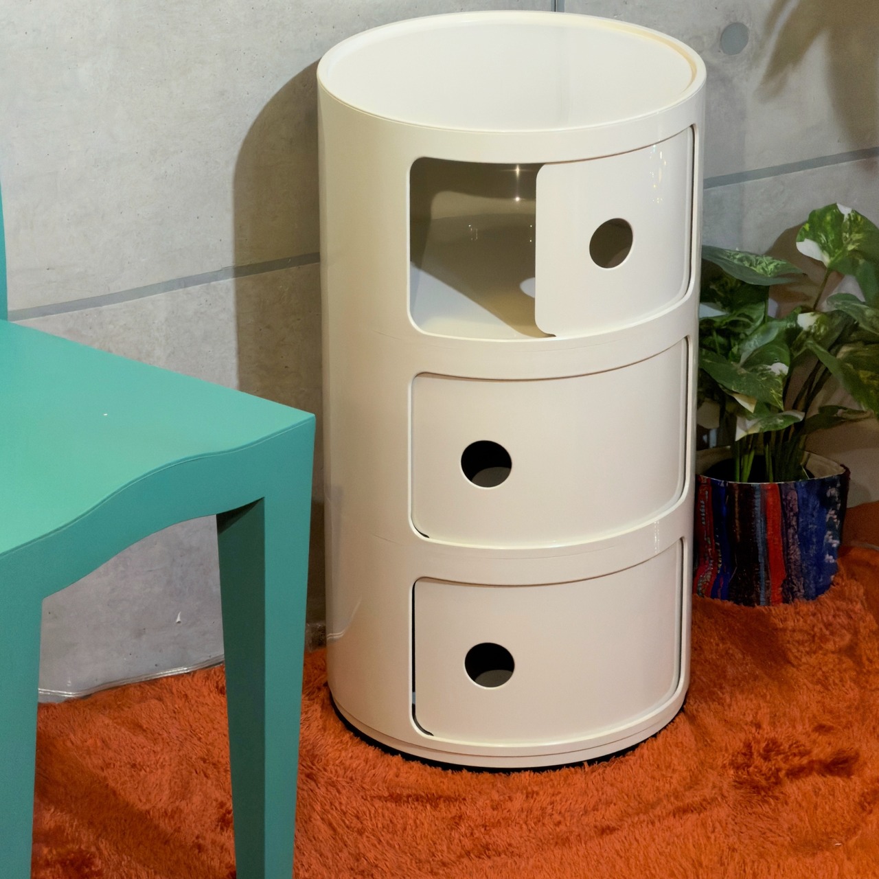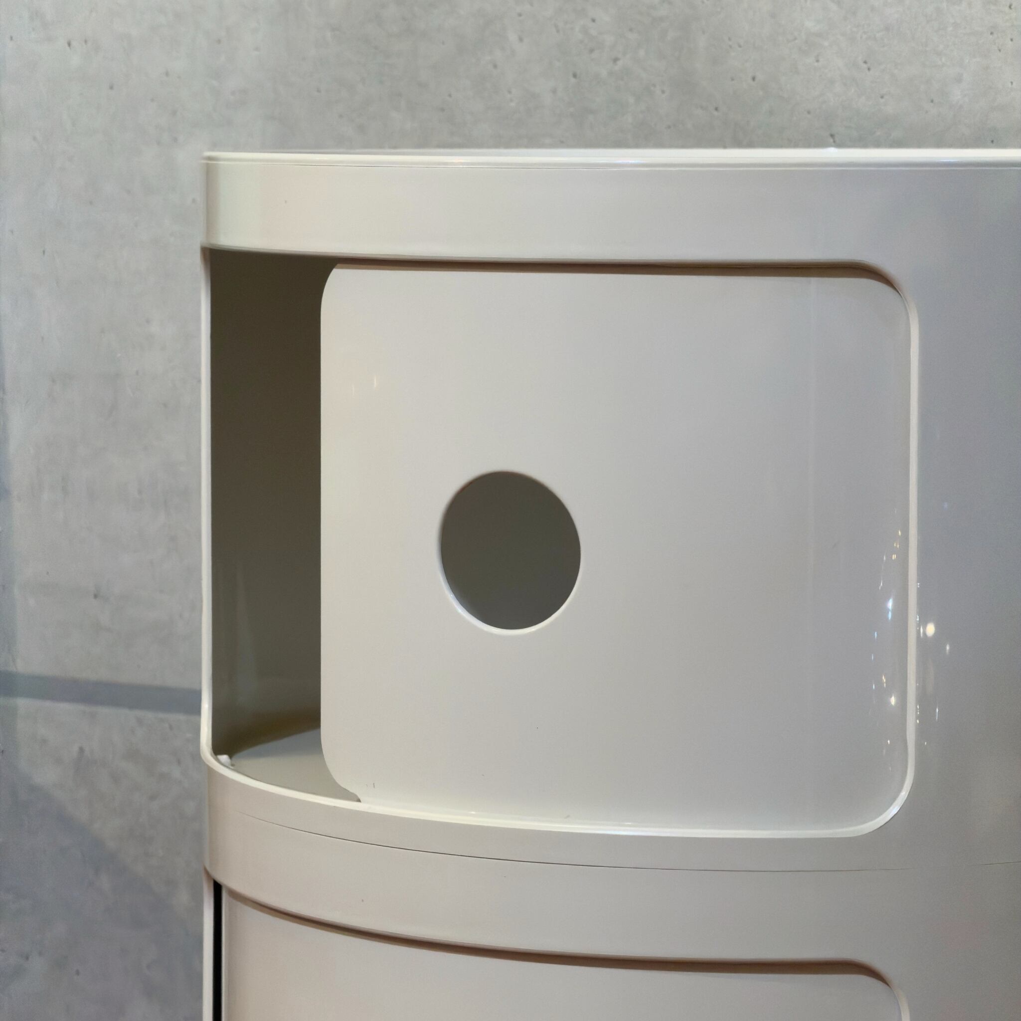 Kartell はプラスチックを量産素材としてではなく、空間を形づくるデザインとして成立させてきたイタリアの代表的なメーカーです。Anna Castelli Ferrieri による Componibili は1967年に登場したシリーズで、軽やかで機能的な収納のあり方を示したプロダクトとして知られています。円筒形の本体にスライド扉を組み合わせたシンプルな構成でありながら収納としての実用性と、少しポップでモダンな輪郭を両立しているのがこのシリーズの魅力です。
