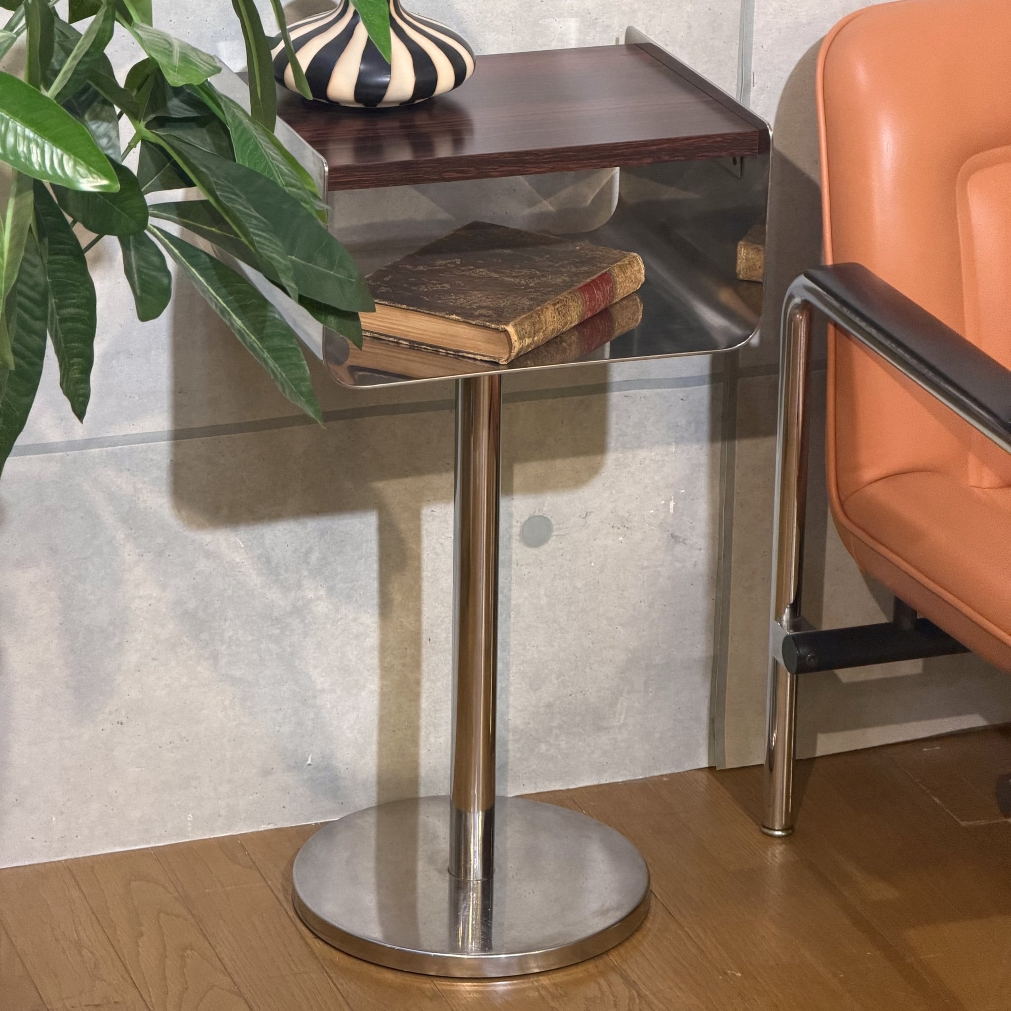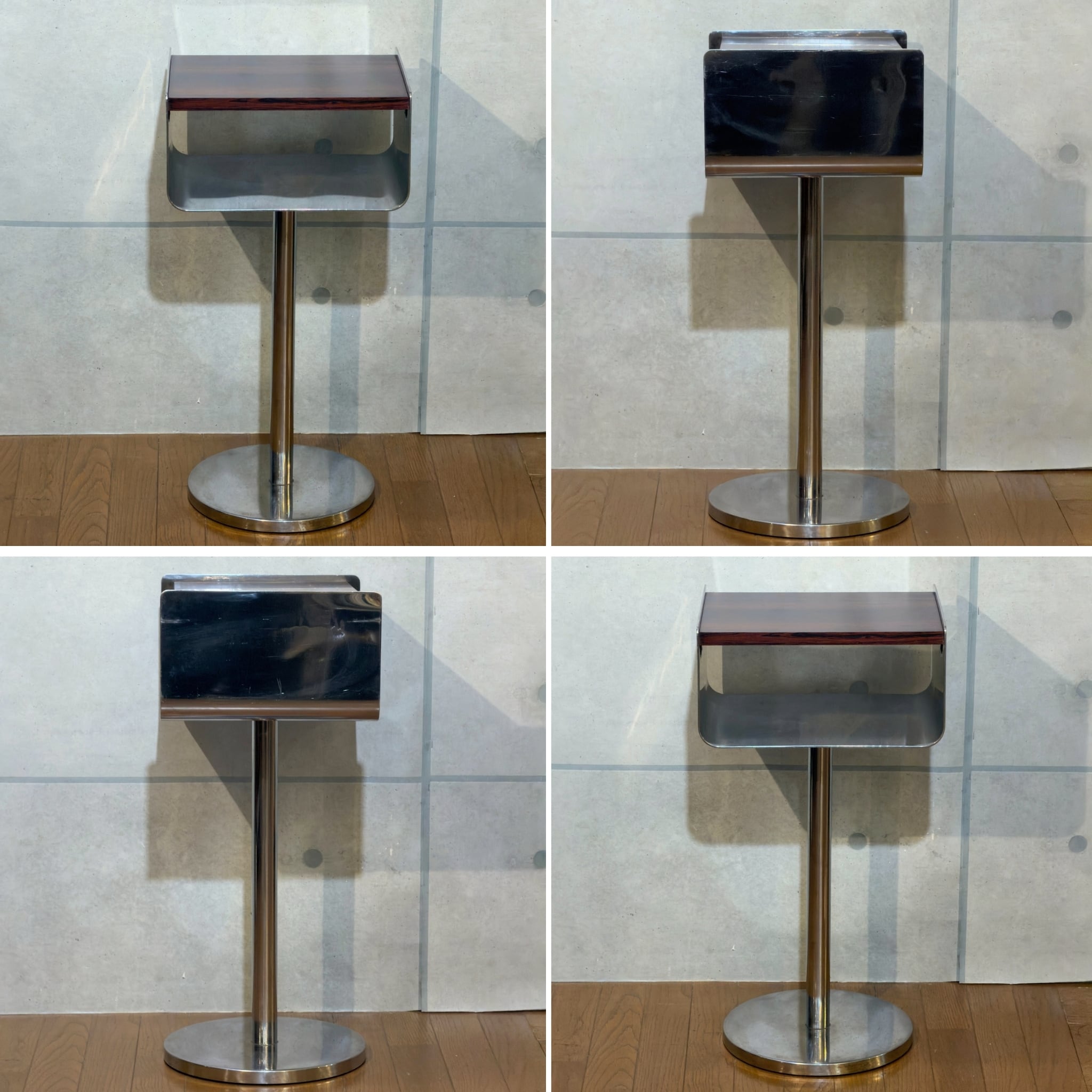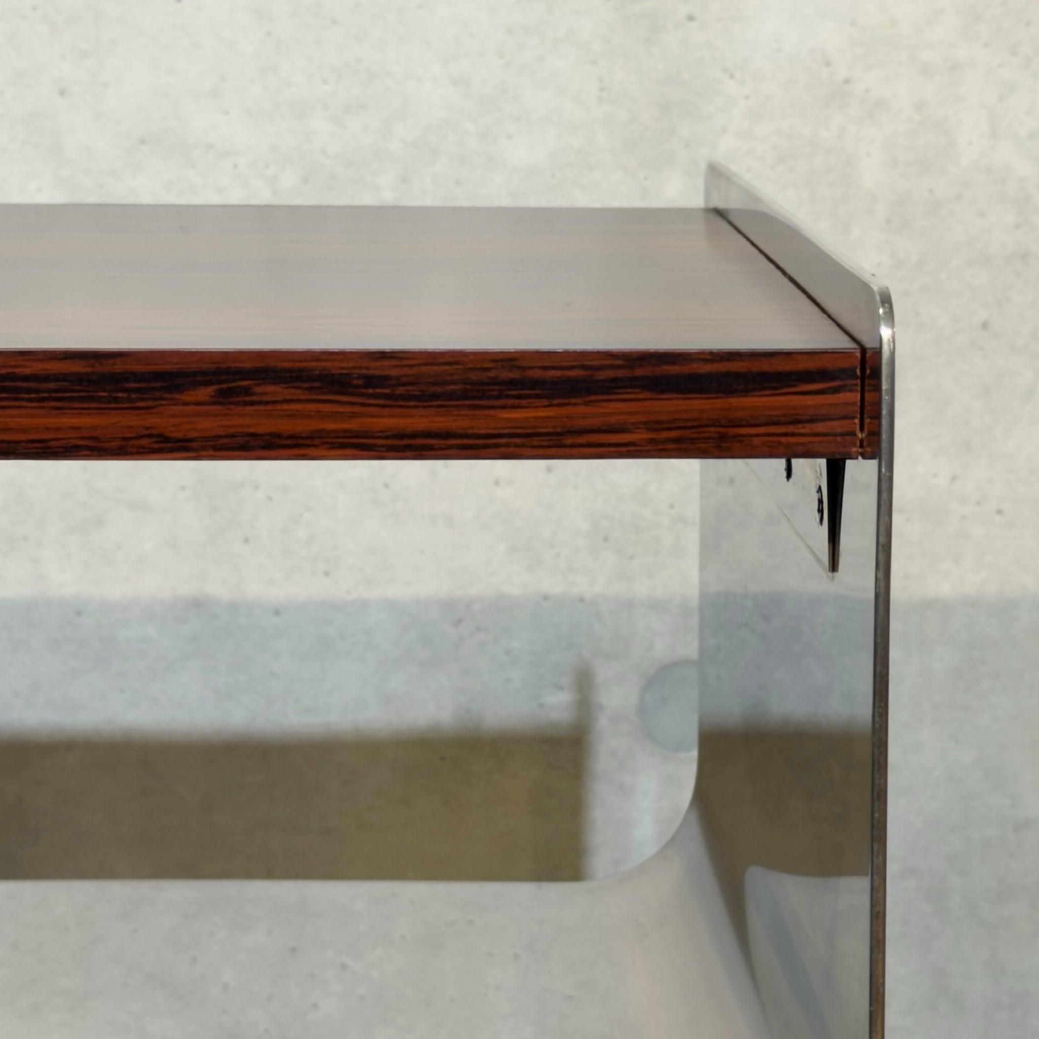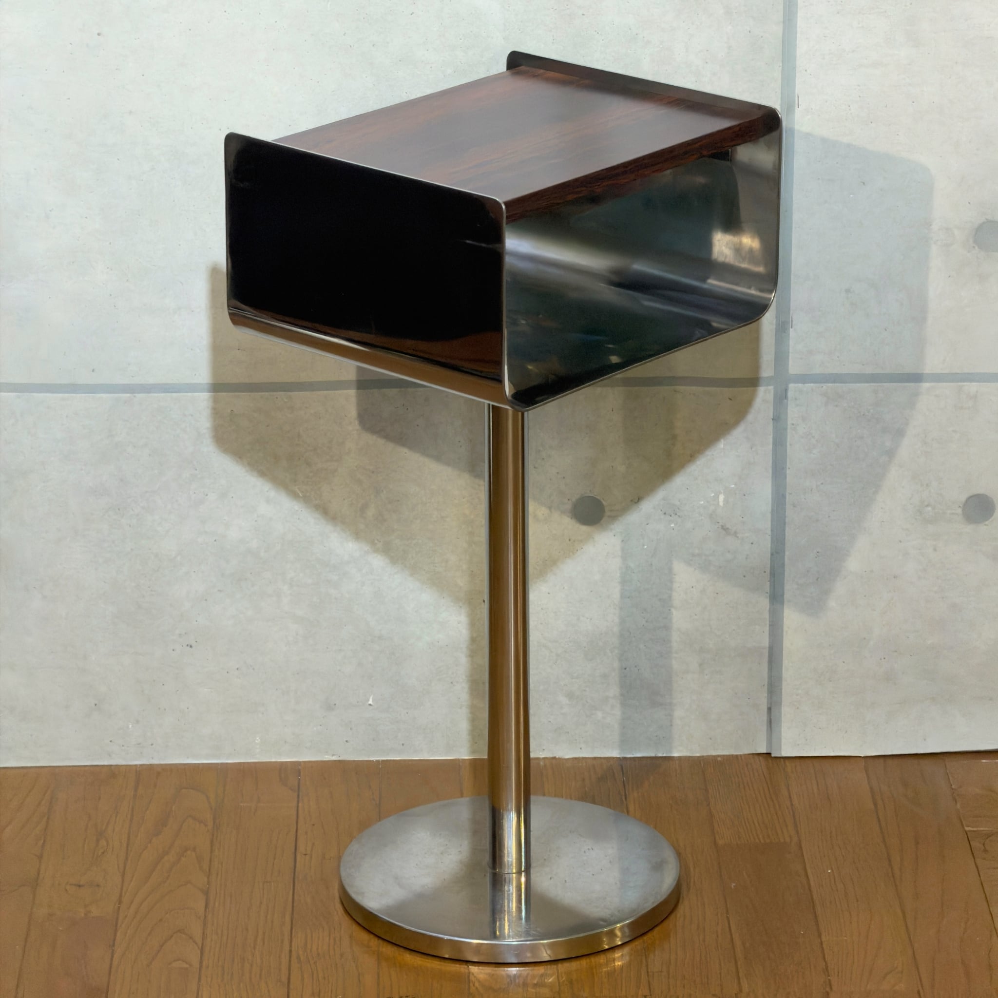 ローズウッドを思わせる濃い木目調の天板とメタル脚の組み合わせはどこか昭和の空気を残しながら、今見るとむしろ新鮮です。ミッドセンチュリーやジャパニーズモダン、スペースエイジ寄りの雰囲気まで感じさせる「いい意味での違和感」がこの個体の魅力だと思います。