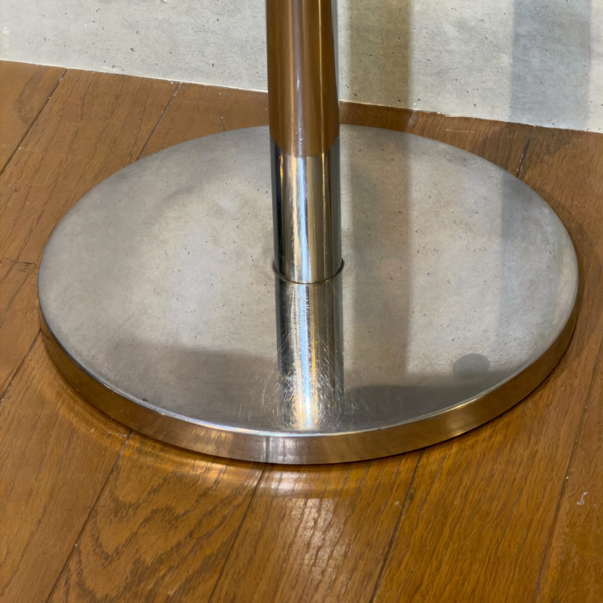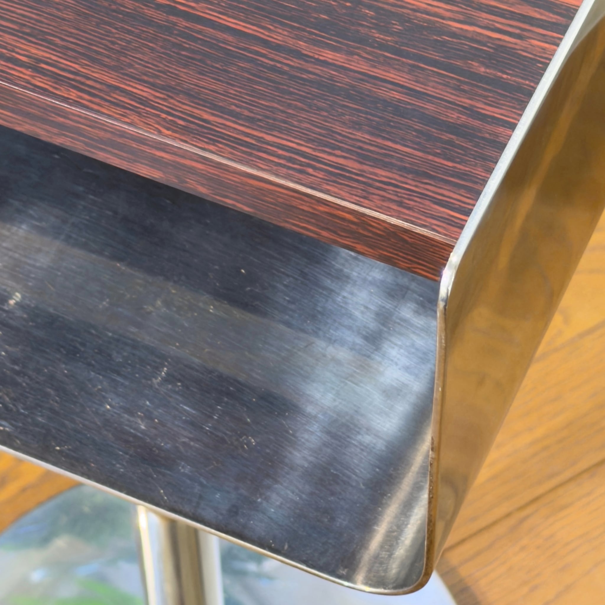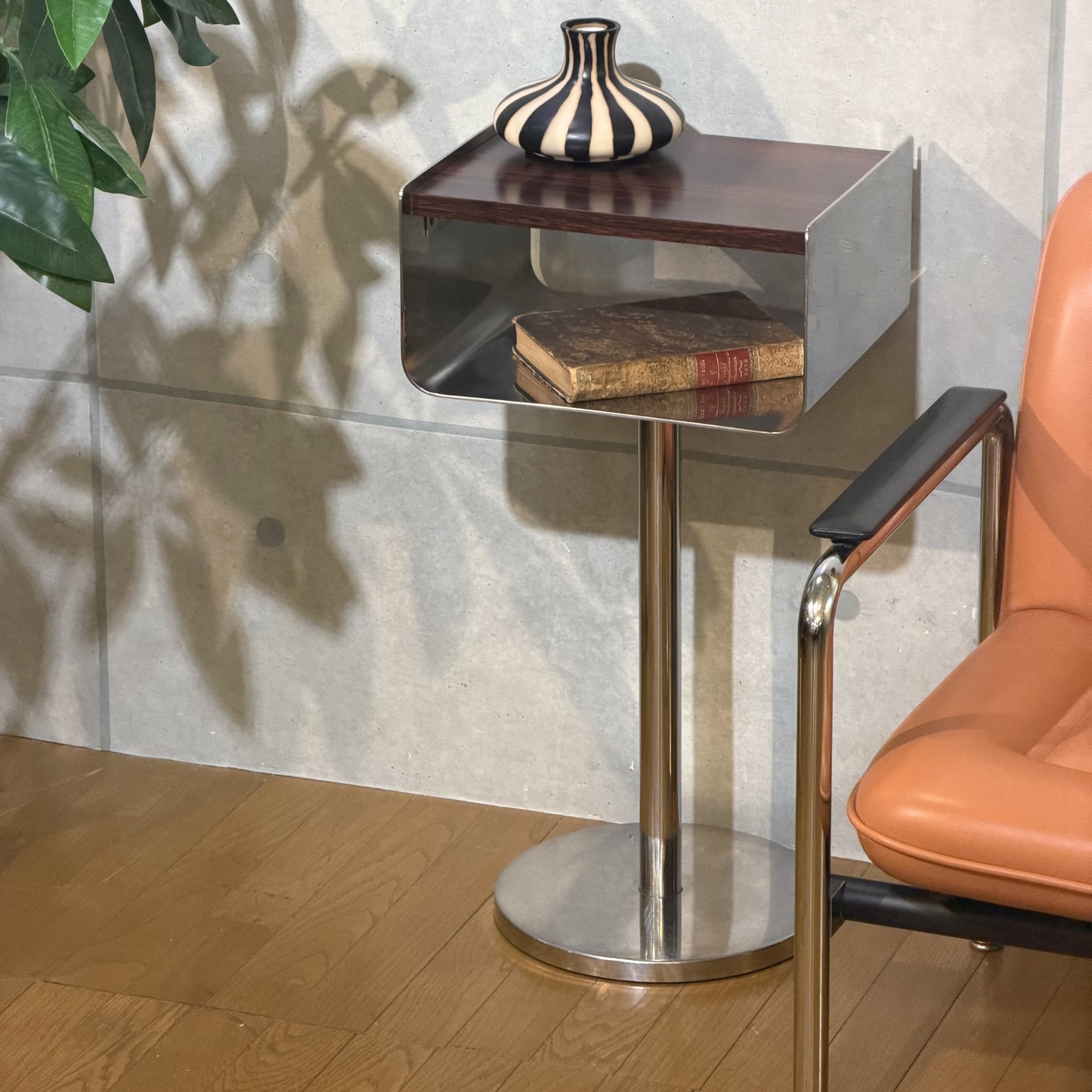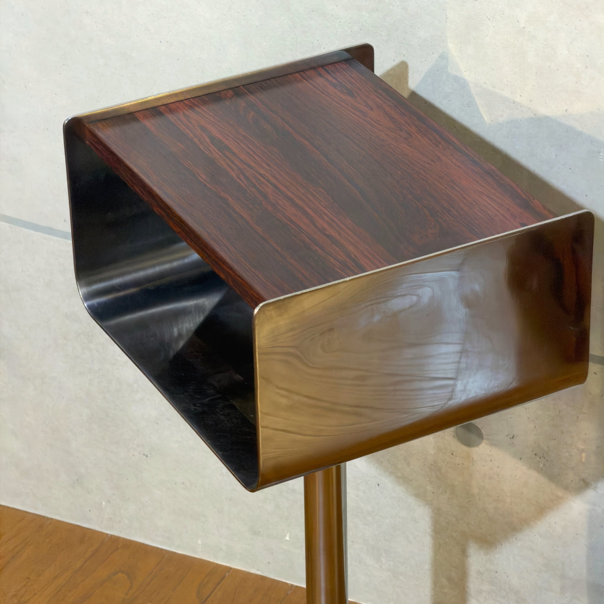 ローズウッドを思わせる濃い木目調の天板とメタル脚の組み合わせはどこか昭和の空気を残しながら、今見るとむしろ新鮮です。ミッドセンチュリーやジャパニーズモダン、スペースエイジ寄りの雰囲気まで感じさせる「いい意味での違和感」がこの個体の魅力だと思います。