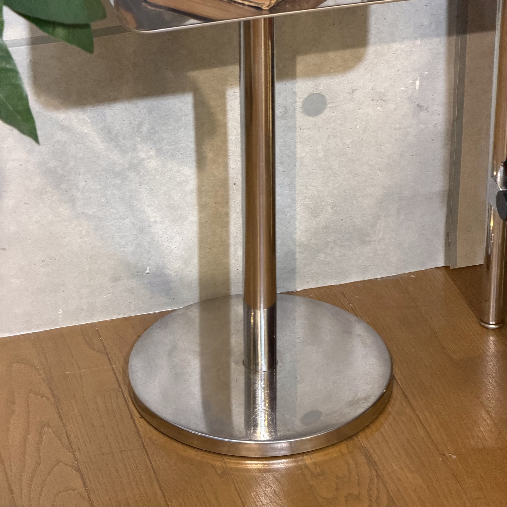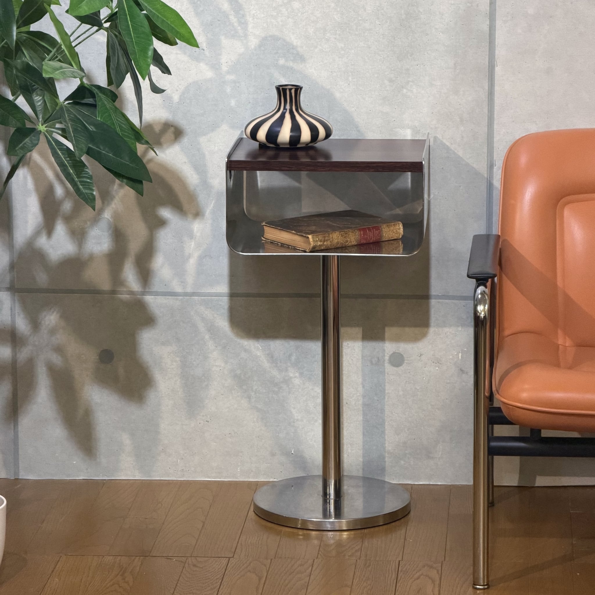メーカーや年代を特定できるタグや刻印はありませんがその分、デザインそのものに惹かれ仕入れた家具でもあります。天板の両脇を立ち上げるように曲げた金属フレーム、安定感を持たせた重みのある脚部、そして細身のプロポーション。小ぶりなサイズながらただの台では終わらない存在感があります。
