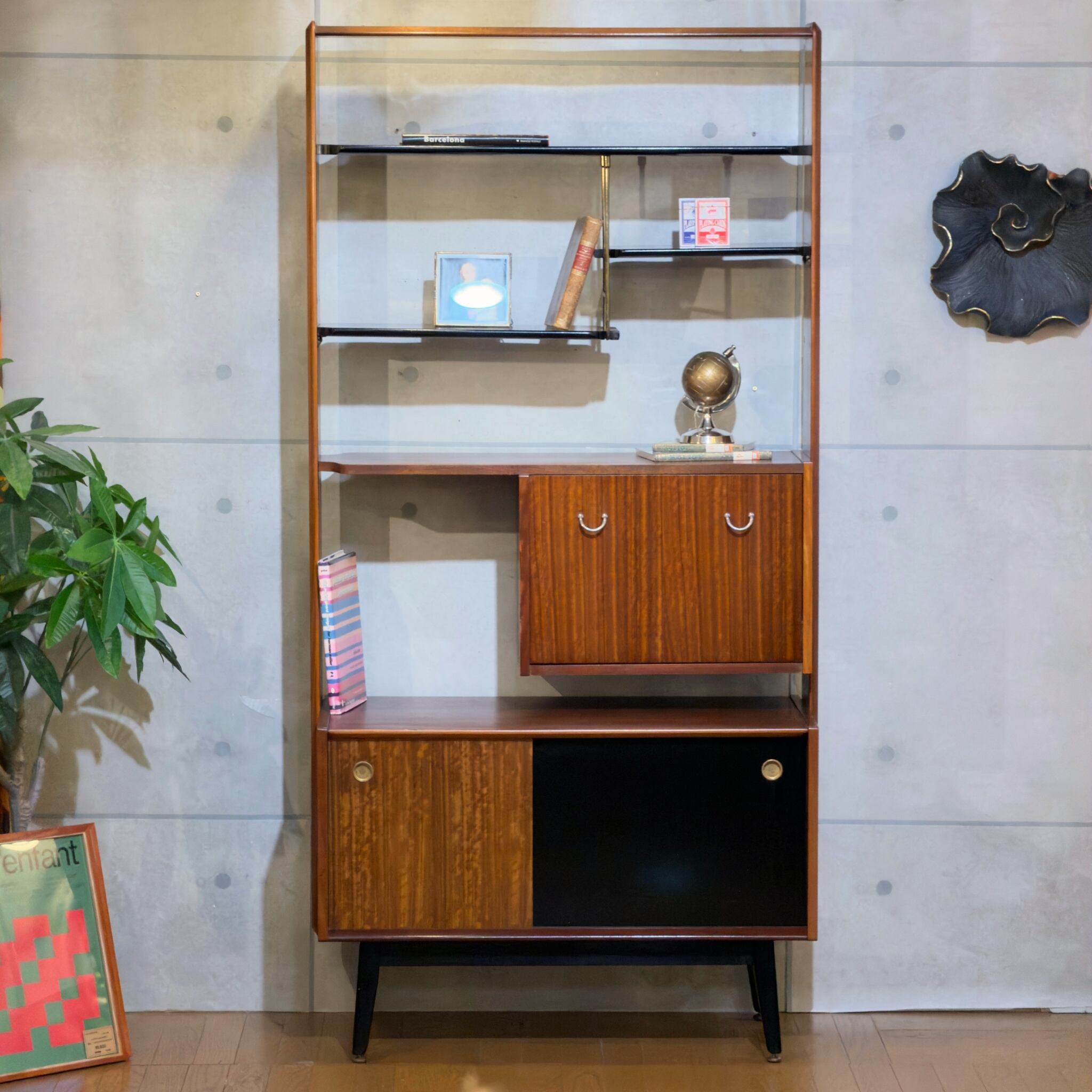 イングランド G-PLANによるTola & Black シリーズのルームディバイダーです。ミッドセンチュリー期の家具には収納するだけでなく、見せるものと隠すものを整理しながら部屋全体を組み立てていく考え方があります。そういった時代らしい発想がよく表れた一台です。