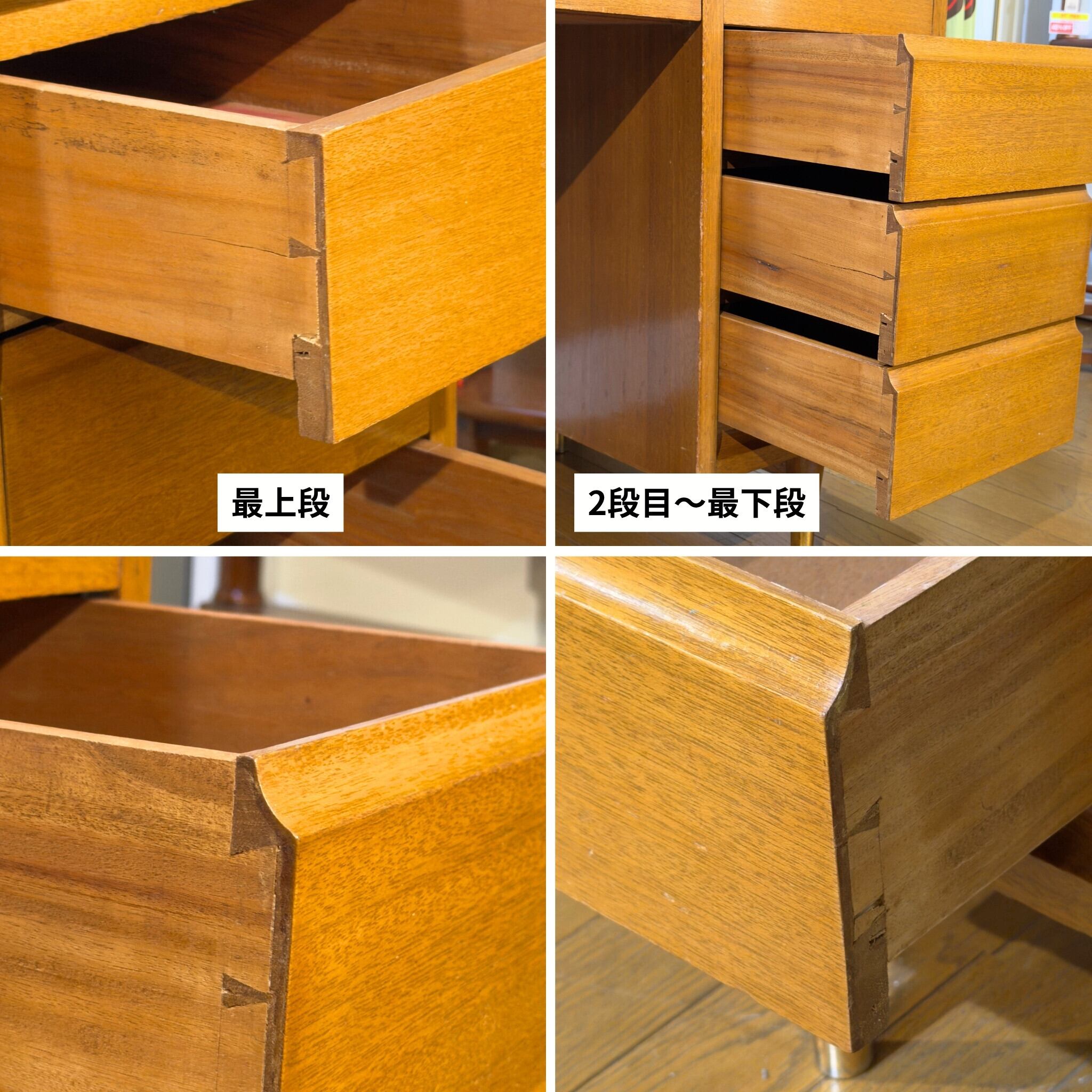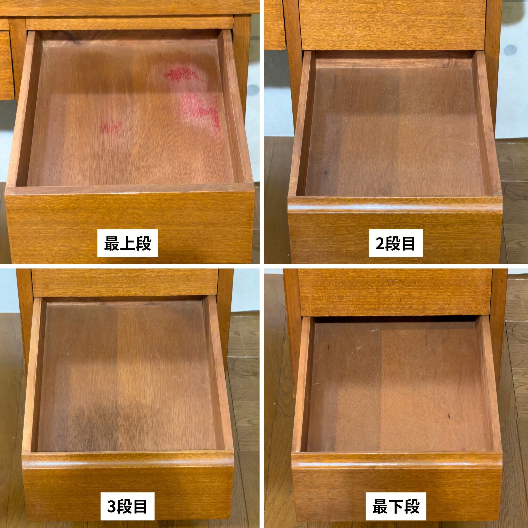 引き出し内部には使用感があり、右袖の最上段には赤い色移りがあります。