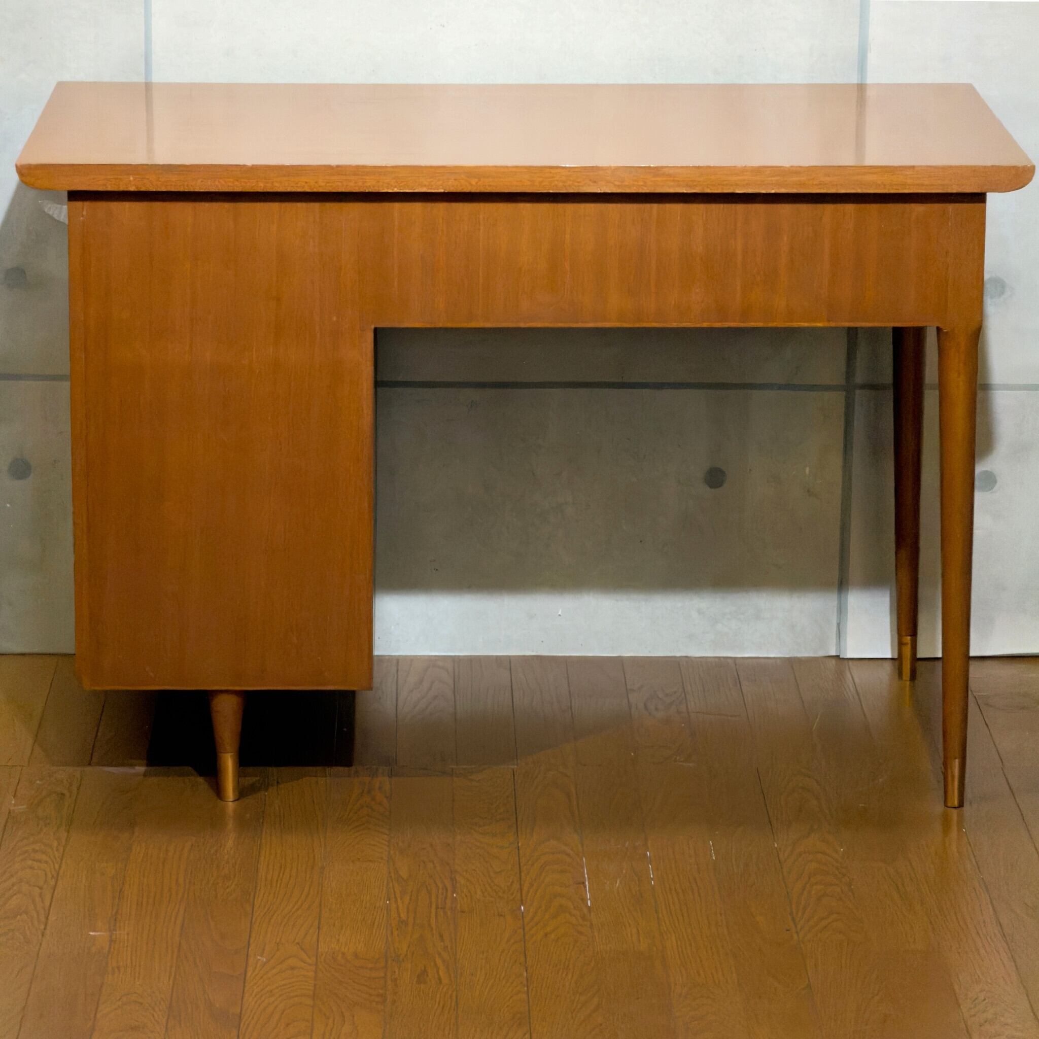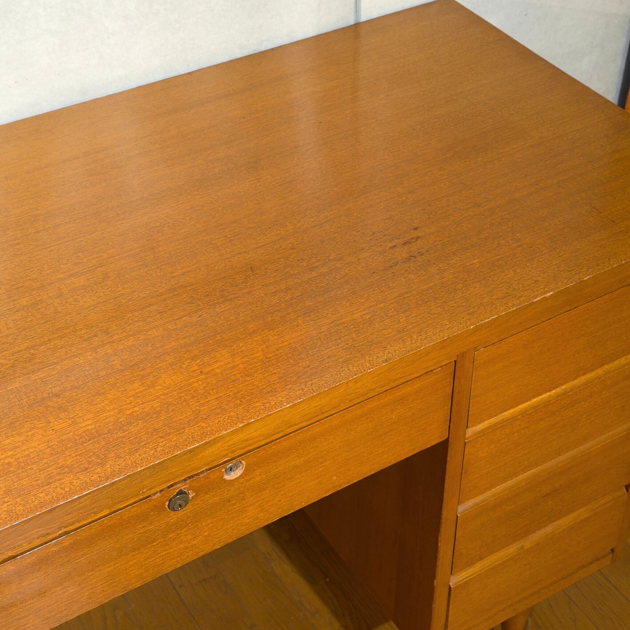 メーカーのロゴやラベルが残っていませんので断定はできないのですが、ミッドセンチュリー期に日本で作られたデスクと思われます。欧米におけるモダン家具の影響を受けながら日本の暮らしに合わせて作られたようなバランスがあり、名前ではなく形で選ぶべきデザインです。