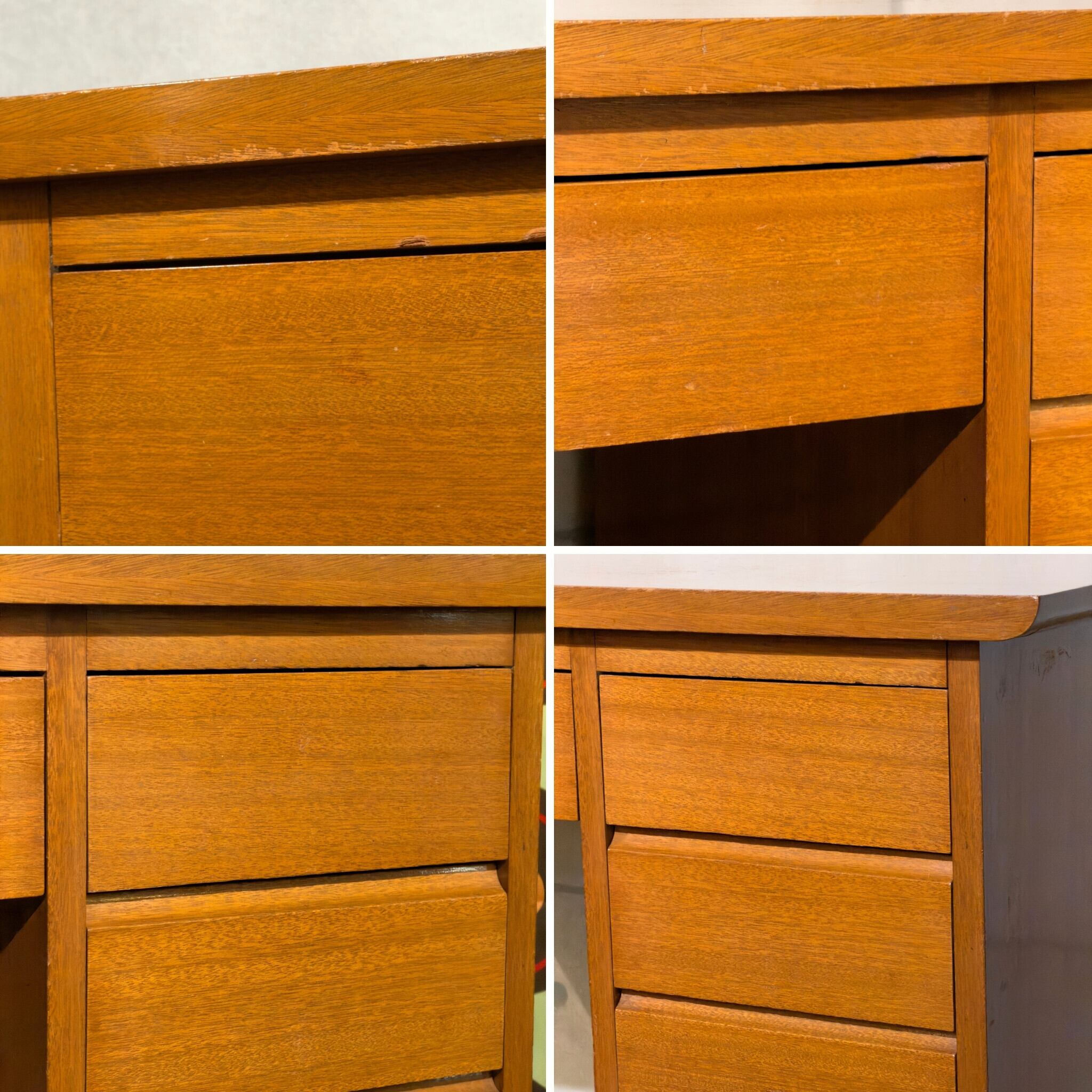 向かって左に幅広の引き出しが1杯、右袖に4杯です。取っ手が表に出ないデザインで見た目がすっきりしています。右袖2段目から最下段にかけては前板の持ち手部分が斜めに削り出されたような形になっていて引き出し内部の造りも良く、作り手のこだわりが感じられます。
