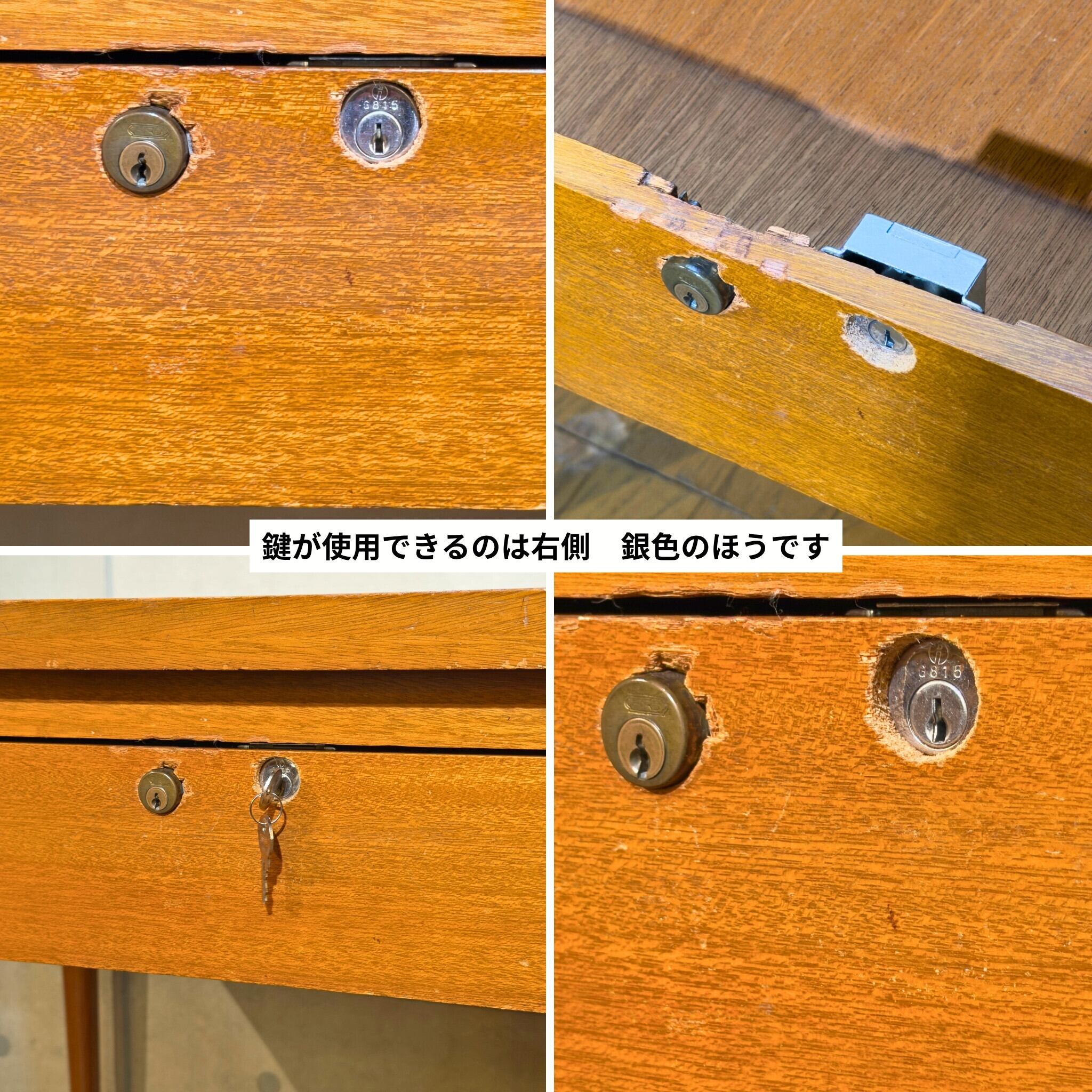 ※幅広の引出しに関して、元々のシリンダー(左)は過去のオーナーが鍵を紛失して新しいシリンダー(右)を取り付けたものと思われます。実際に施錠できるのは右側(銀色)の錠前となります。鍵は1本+スペア1本の合計2本が付属されます。